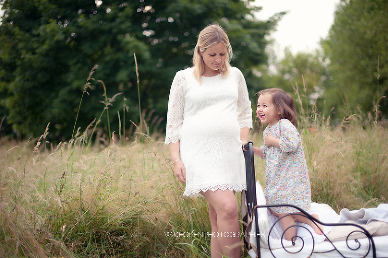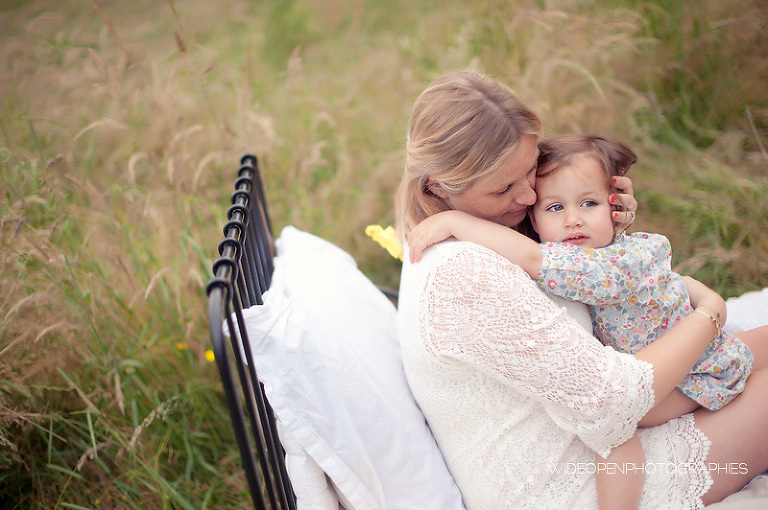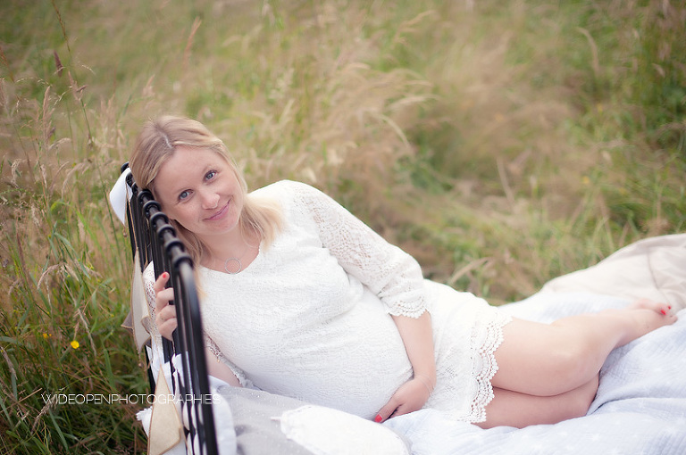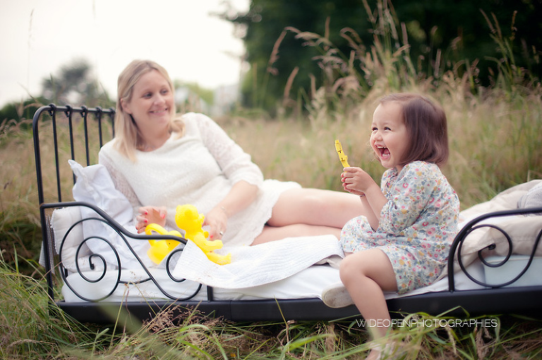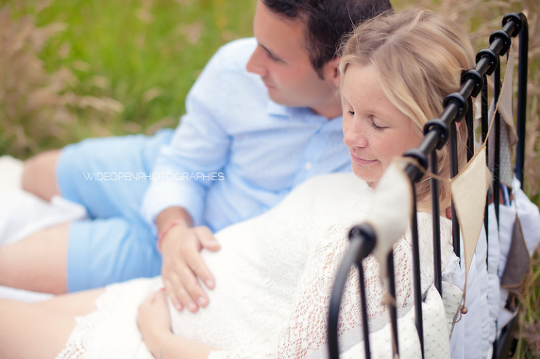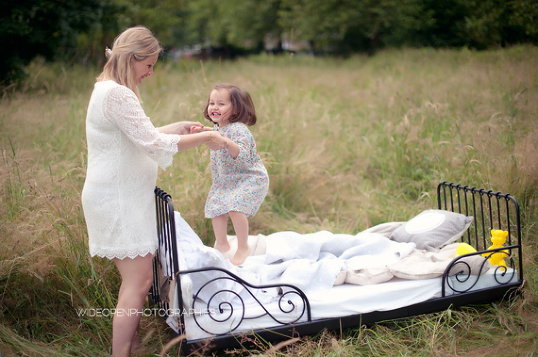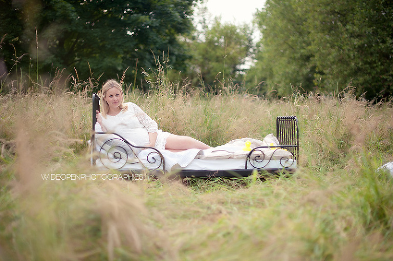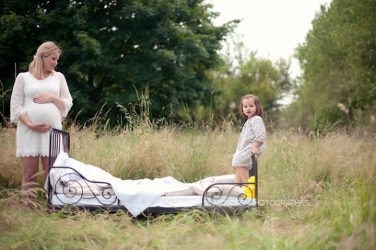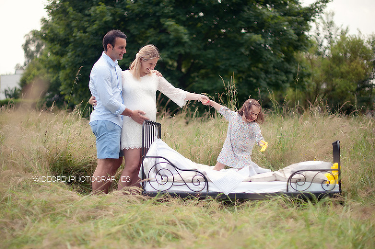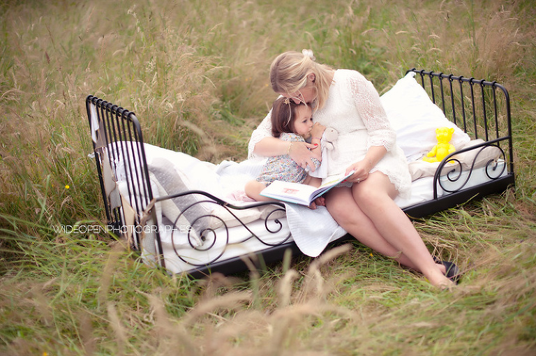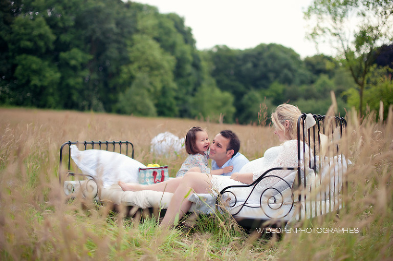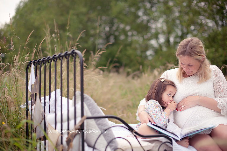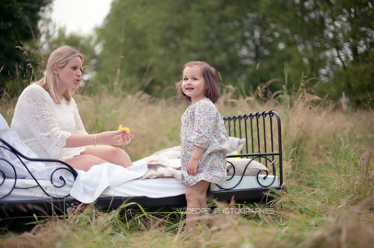 Cette séance grossesse a été un vrai bonheur, Marion m’a dit tu as carte blanche, tu as des envies particulières? Le rêve pour moi! Nous avons alors concrétisé l’idée du lit en pleine nature. Chose qui n’a pas été si facile que cela et surtout je me rappelle de la tête de Mike quand il a vu le déménagement que cela impliquait! Lison a découvert sa chambre recréée en plein air, un peu interrogative mais il faut avouer que pouvoir sauter sur son lit au milieu d’un champ c’est pas tous les jours!