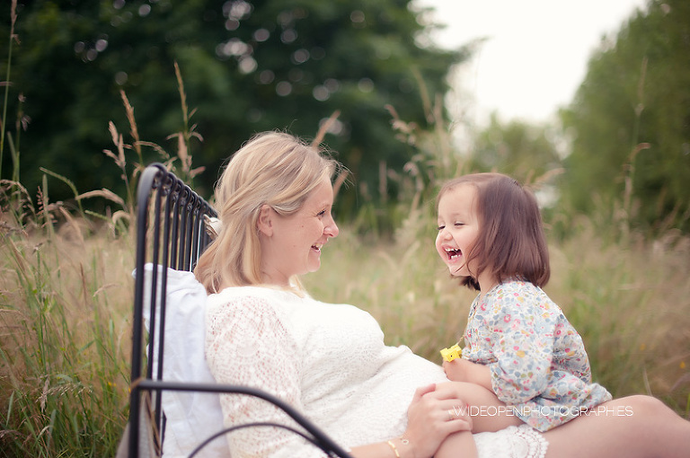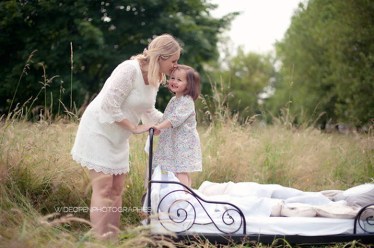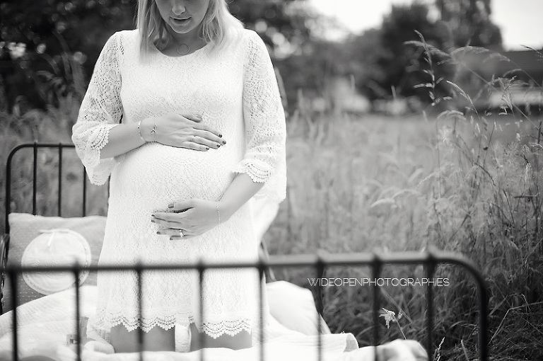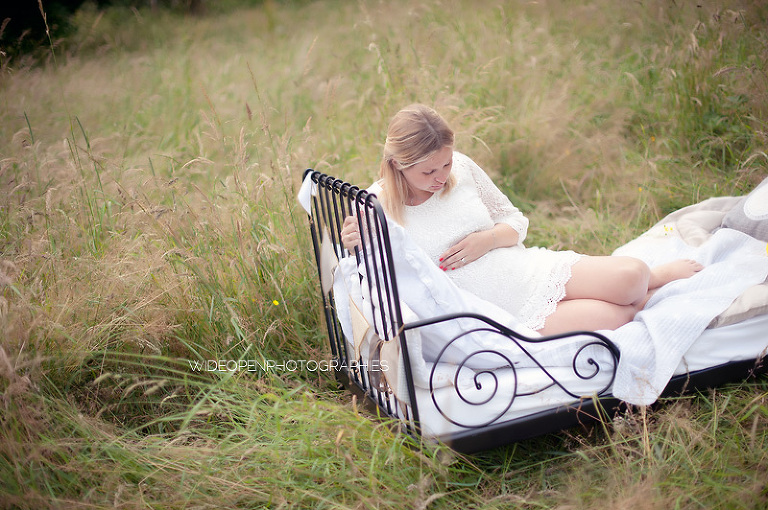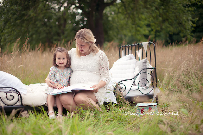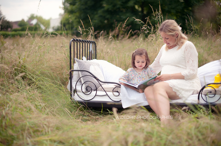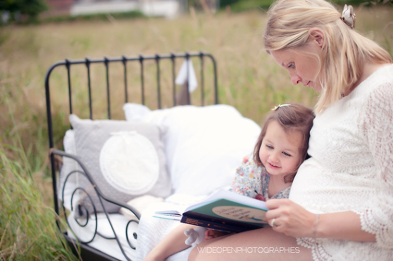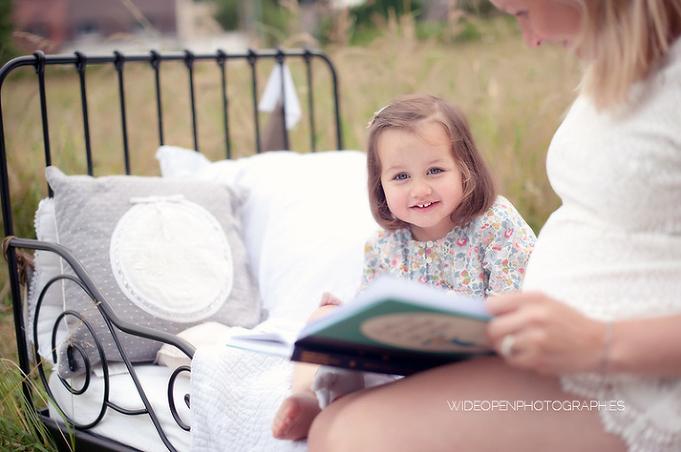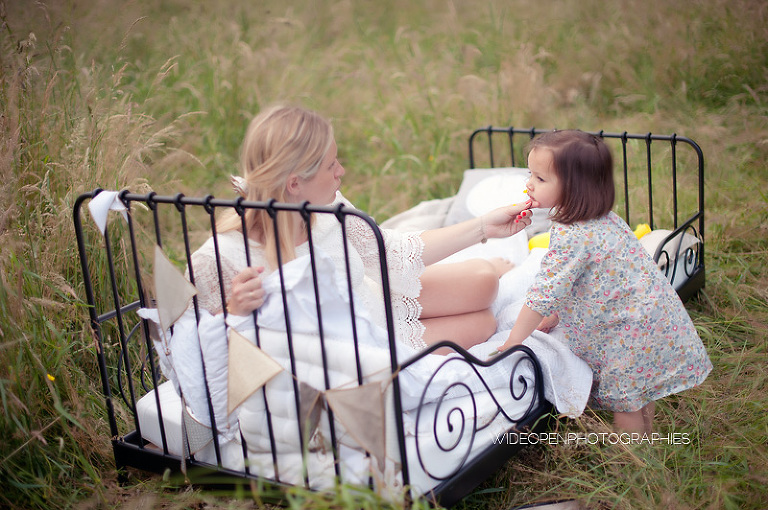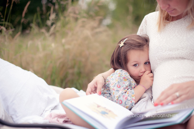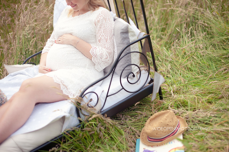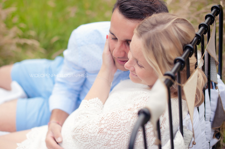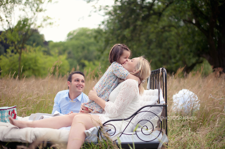 Cette séance grossesse a été un vrai bonheur, Marion m’a dit tu as carte blanche, tu as des envies particulières? Le rêve pour moi! Nous avons alors concrétisé l’idée du lit en pleine nature. Chose qui n’a pas été si facile que cela et surtout je me rappelle de la tête de Mike quand il a vu le déménagement que cela impliquait! Lison a découvert sa chambre recréée en plein air, un peu interrogative mais il faut avouer que pouvoir sauter sur son lit au milieu d’un champ c’est pas tous les jours!