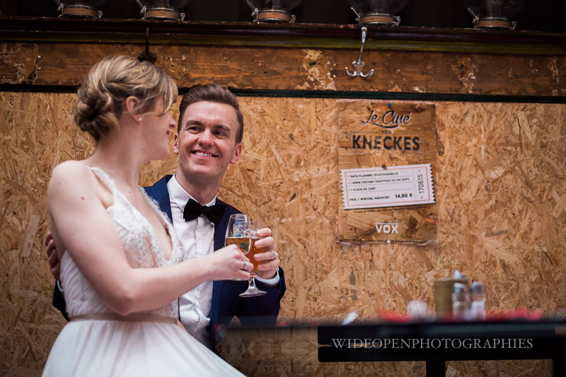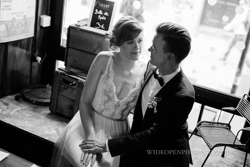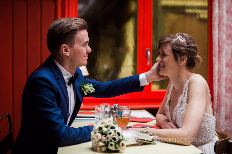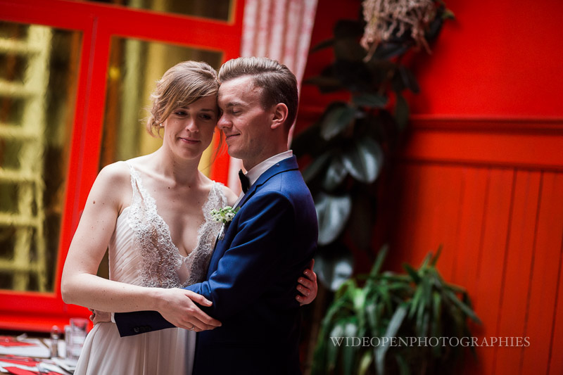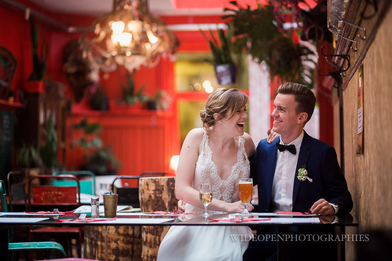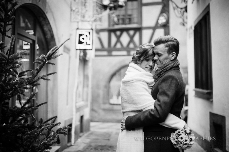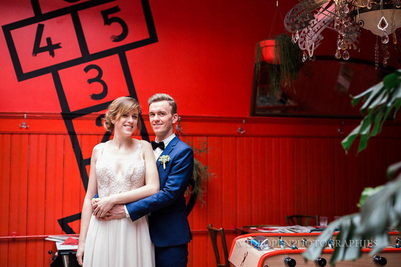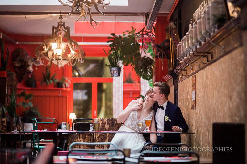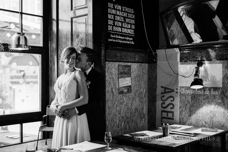 Pour continuer l’idée du mariage pas comme les autres, ils avaient choisi de faire une séance day after un petit matin de janvier dans les rues de Strasbourg. Mais forcement il fait froid à cette période de l’année, donc nos jeunes mariés avaient déniché un petit restaurant un brin vintage et rien que pour eux. Ce côté guinguette, rétro et chine, moi j’adore! Surtout avec le contraste de la robe de mariée et du costume.