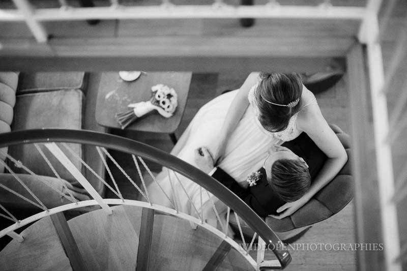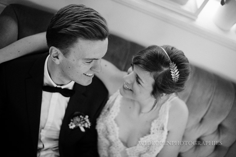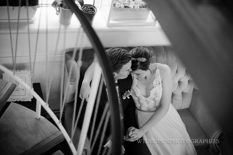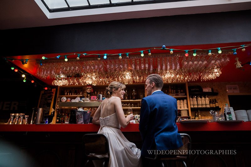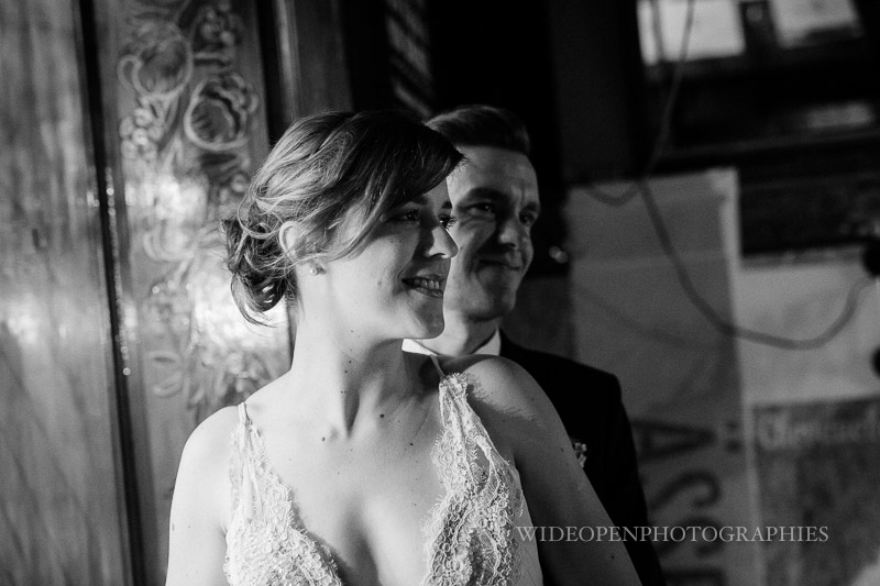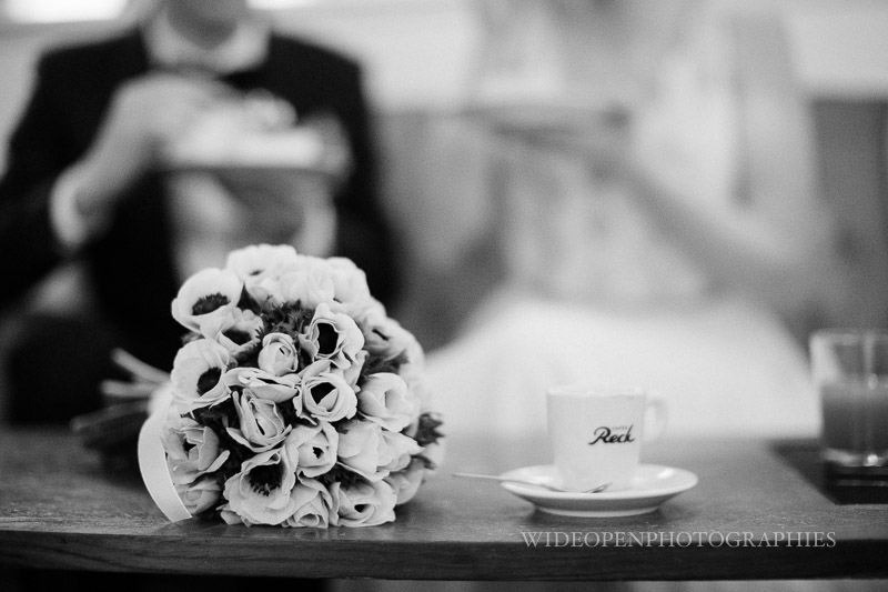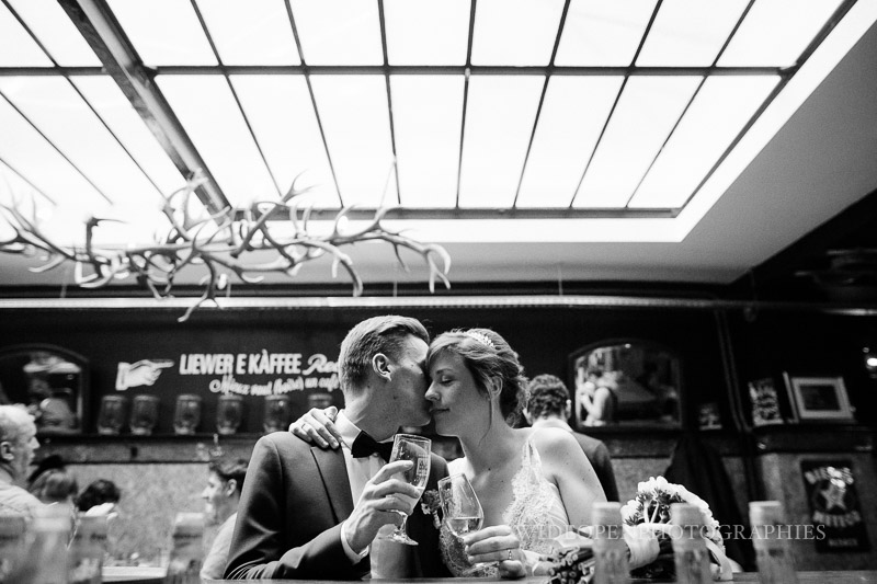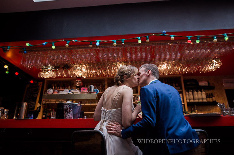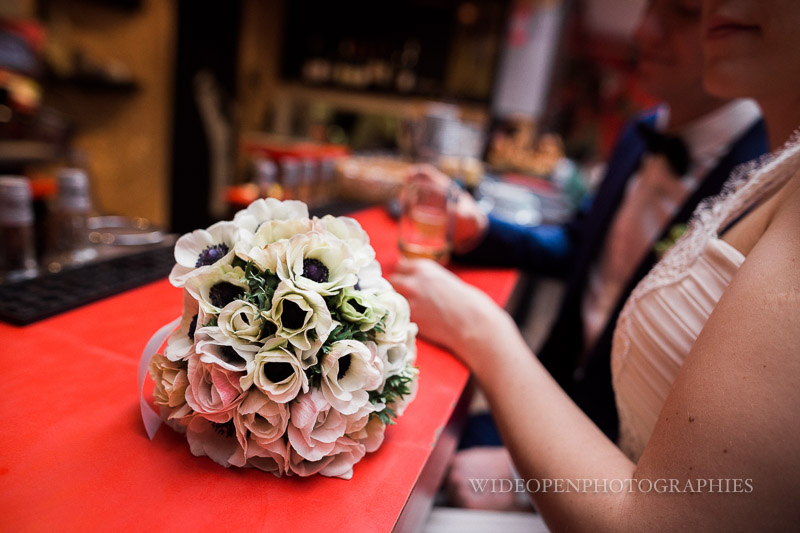 Pour continuer l’idée du mariage pas comme les autres, ils avaient choisi de faire une séance day after un petit matin de janvier dans les rues de Strasbourg. Mais forcement il fait froid à cette période de l’année, donc nos jeunes mariés avaient déniché un petit restaurant un brin vintage et rien que pour eux. Ce côté guinguette, rétro et chine, moi j’adore! Surtout avec le contraste de la robe de mariée et du costume.
