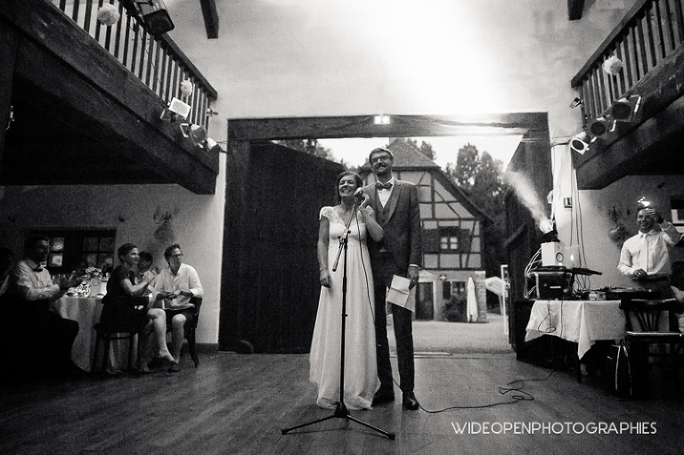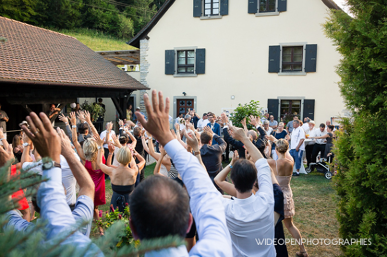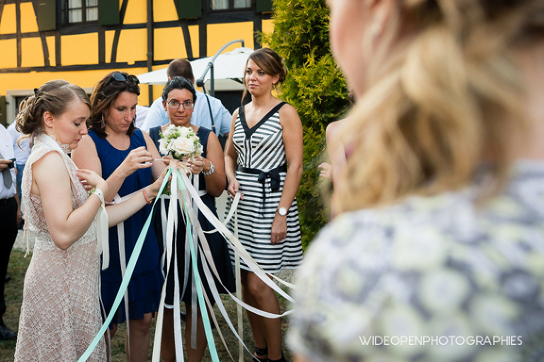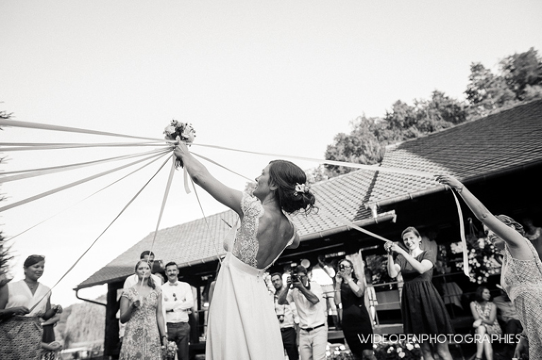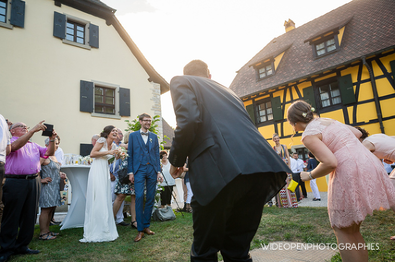 Et pour finir en beauté, un cocktail animé et repas au moulin bas, à Lingsdorf. Et pour changer du lancer de bouquet de la mariée, Anne avait choisit une autre tradition que l’on voit moins souvent mais tellement « graphique » qui n’abime pas le bouquet et qui rend très bien en photo d’ailleurs 😉