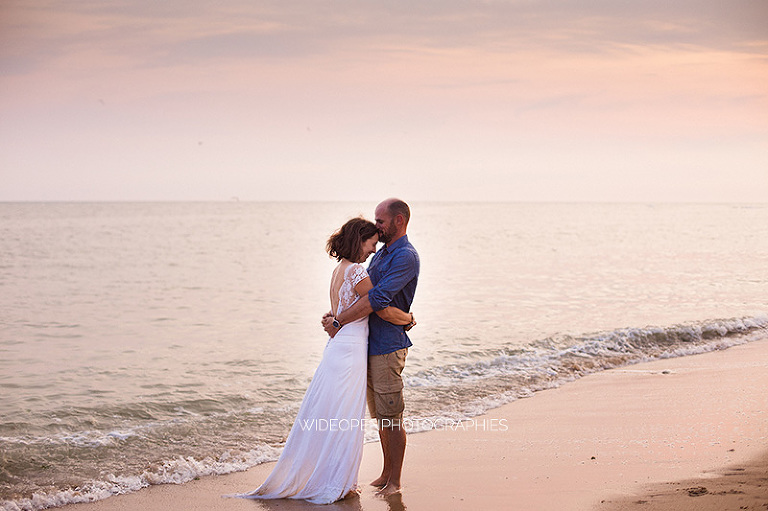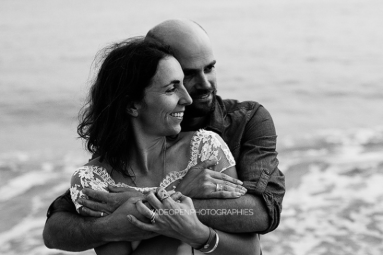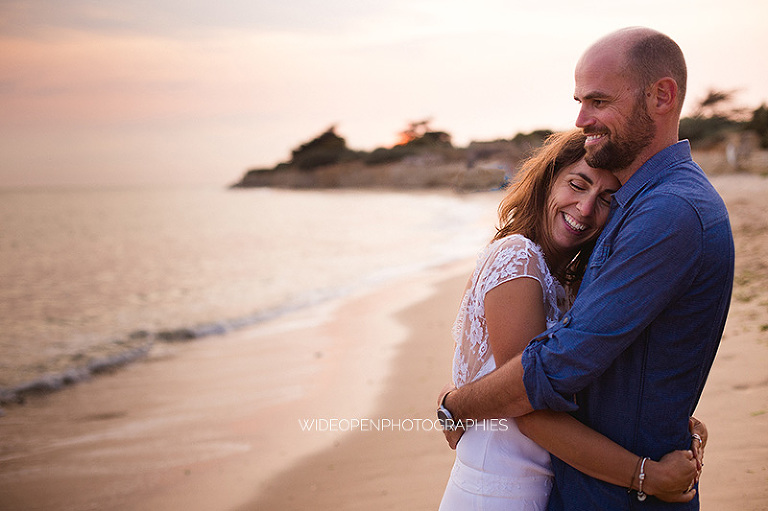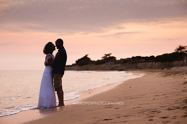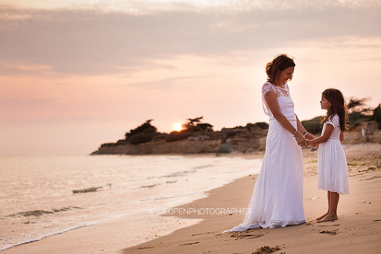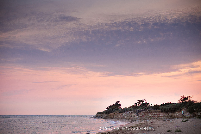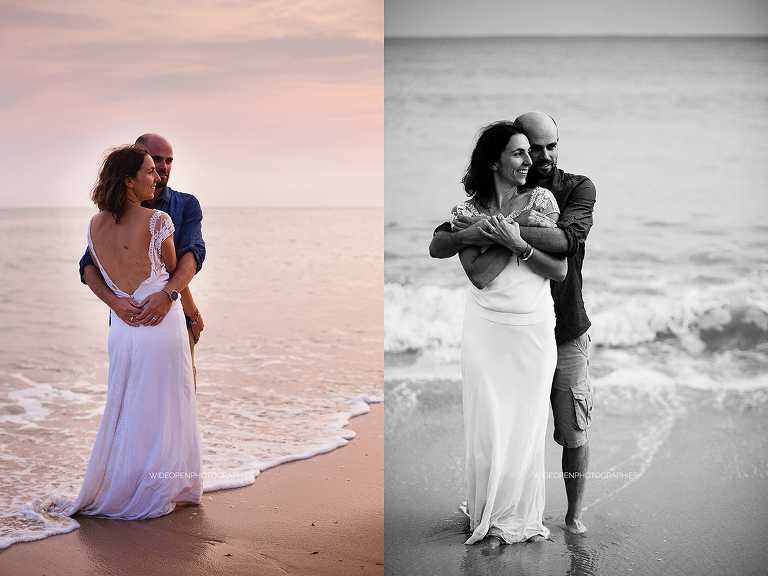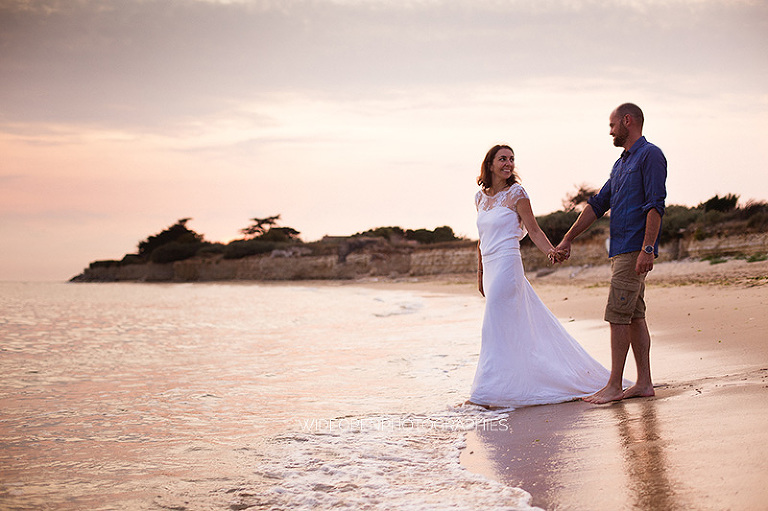 C’est pour ça qu’une fois une partie de la séance faite dans les ruelles de Saint Martin de Ré, nous avons filé à la plage pour le soleil couchant et….. les envoyer dans l’eau!!! Ce n’est pas un trash the dress mais juste le plaisir d’oser et en rire 😉