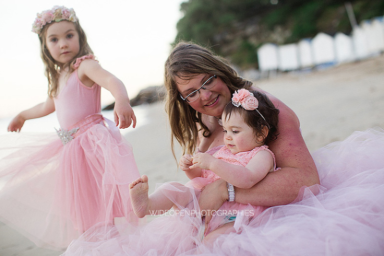 2 poupées sur une plage de rêve déserte avec les cabines de plage en décor de fond, rien que pour nous. J’adore faire des séances photo famille à Noirmoutier!